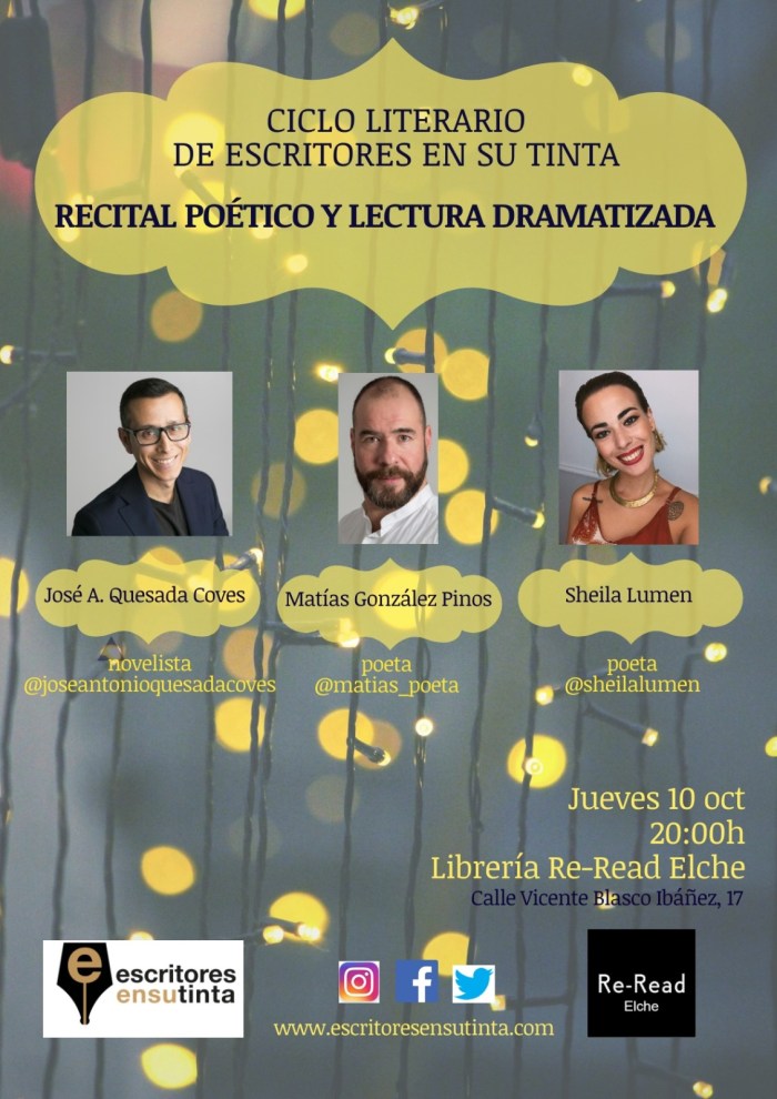Entre las novedades que este año 2019 fueron propuestas, para relanzar la poesía y lectura dramatizada que tan buena acogida está teniendo entre el público en los últimos meses, se propuso presentar un ciclo mensual con tres escritores de la asociación por actuación, donde serán leídas poesías propias y fragmentos de obras literarias, terminando por dejar un micro abierto para aquel oyente que quiera hacer pública su pasión literaria y/o poética. Una novedosa ocasión que hace que el arte escrito se transforme en oral. Así, este jueves, 10 de octubre, a las 20:00 dará comienzo la nueva propuesta por parte de Escritores en su tinta. Nuestros compañeros José Antonio Quesada Coves, Sheila Lumen y Matías González Pinos, serán los primeros en encauzar esta maravillosa andadura en la librería Reread en Elche. Todo el mundo está invitado a ser partícipe de tal evento.