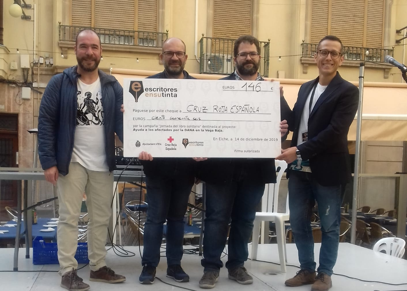 Cualquier ayuda es poca para nuestros vecinos de la Vega Baja afectados hace poco por la Dana. Obvio, nuestros ojos no conviven con la devastación de dichos parajes, sin embargo, no podemos pasar por alto y olvidar la necesidad de reorganizar el presente resultante de aquella tormenta. Nuestra asociación Escritores en Su Tinta, también quiso poner su granito de arena, o mejor dicho, nuestra tinta en el tintero; y salimos a la calle con nuestras mejores intenciones. Los días 13 y 14 de diciembre, en el centro de Elche, nuestras letras impresas, nuestras voces y nuestra música blandía el gélido ambiente por una buena causa. Y como fuera de esperar, nuestra intención surtió efecto, consiguiendo que muchos ilicitanos se asomaran, y nos acompañasen en lo que se convirtió un momento «literaturalmente» mágico.