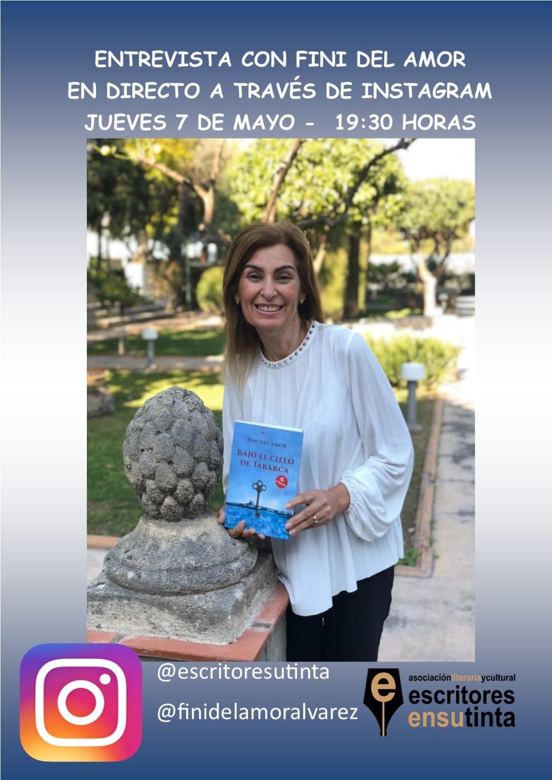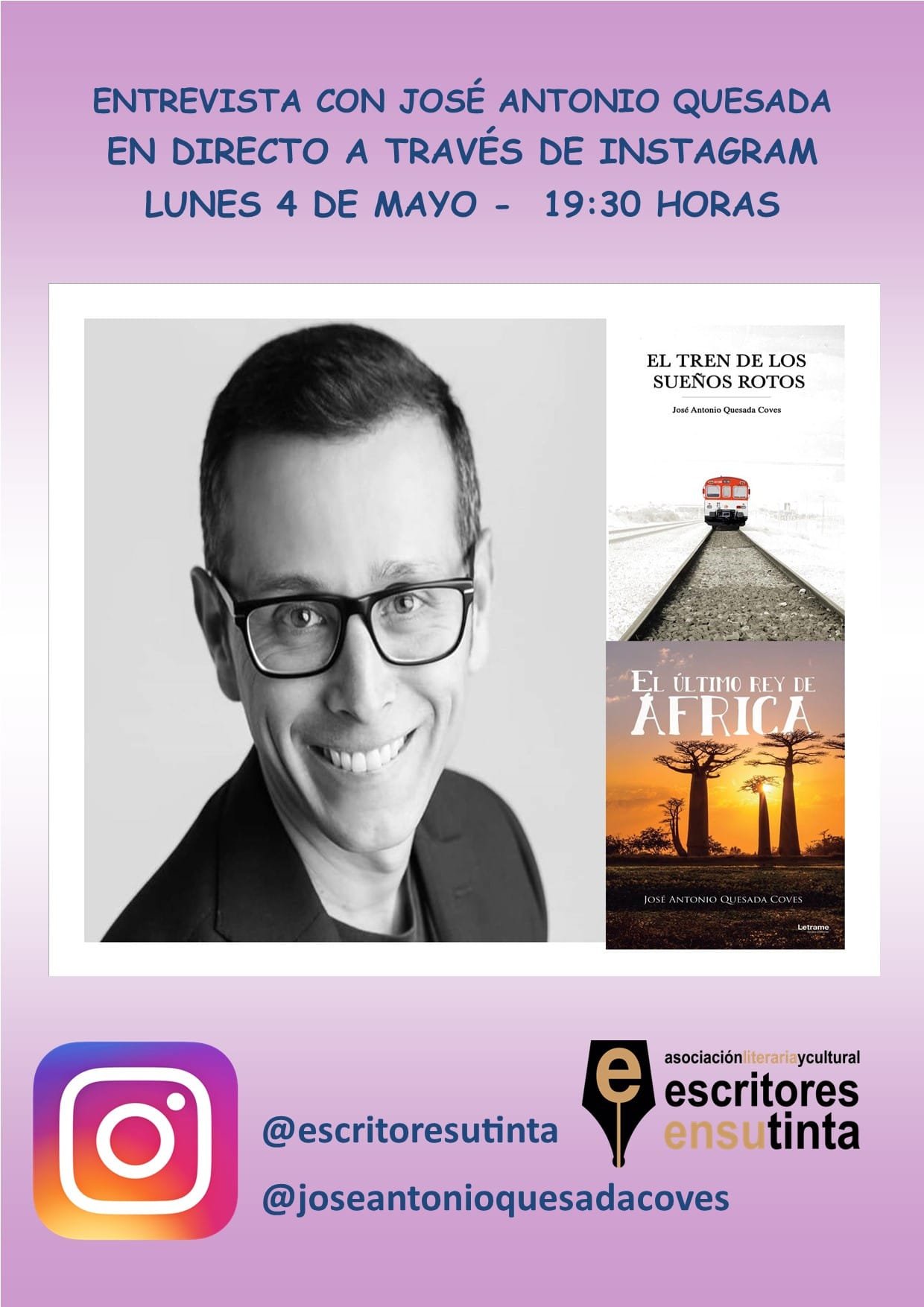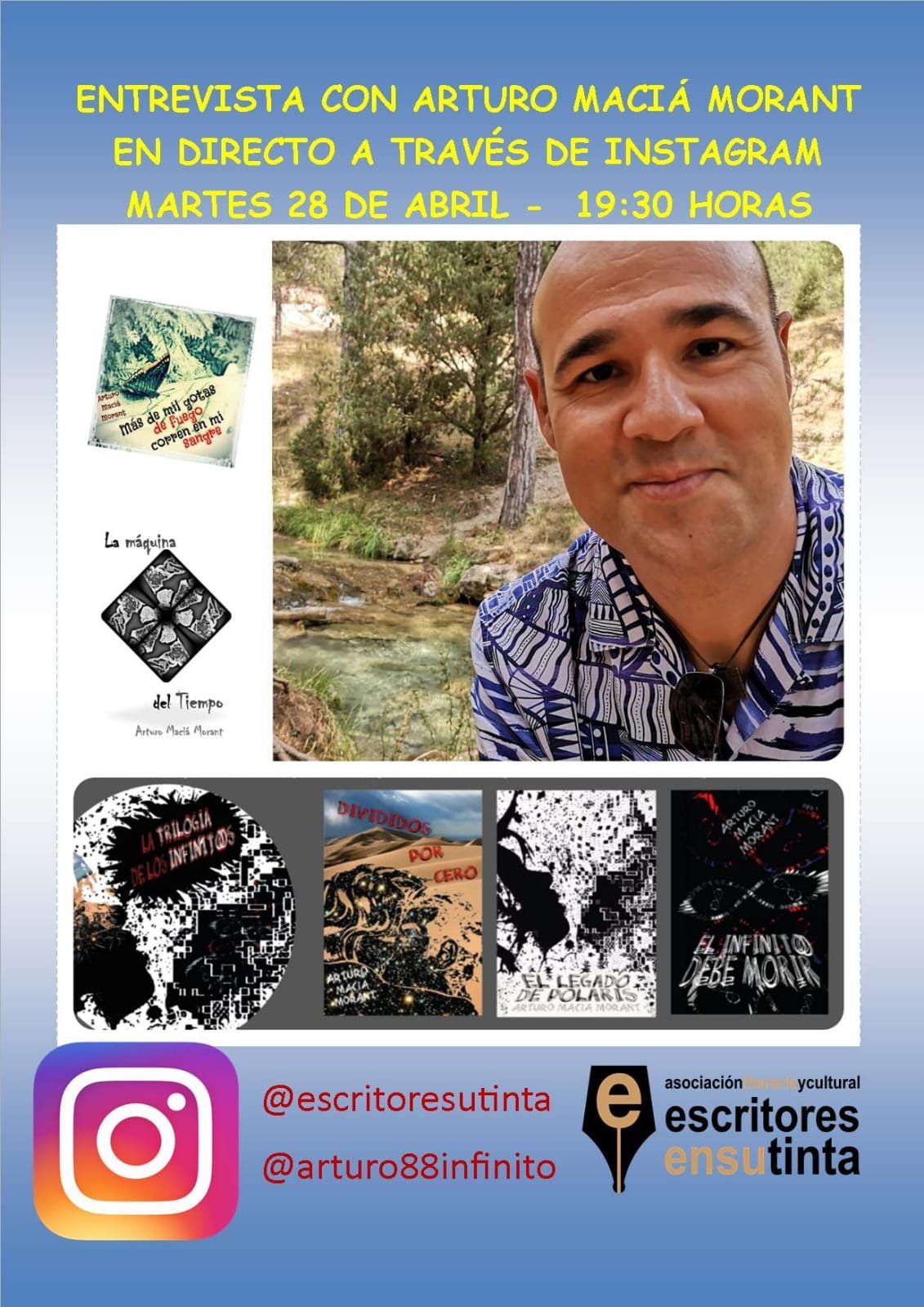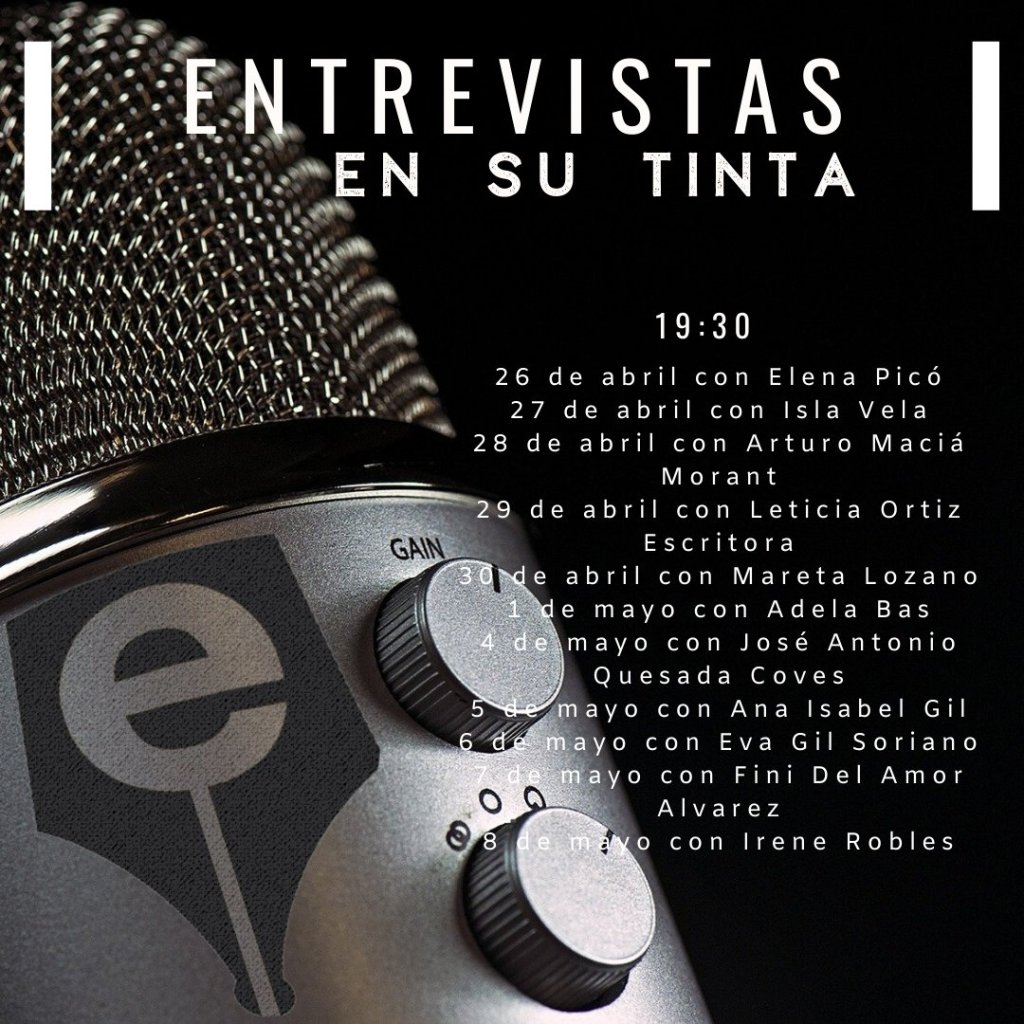 Desde el próximo 26 de abril os vamos a acompañar desde casa. Todos los días a las 19’30 horas tendremos entrevistas con escritores y escritoras de la asociación. Será a través de instagram y totalmente en directo. Podrás ver las entrevistas en la cuenta de instagram de la asociación @escritoresutinta y en las cuentas de cada uno de los escritores. La programación es la siguiente: