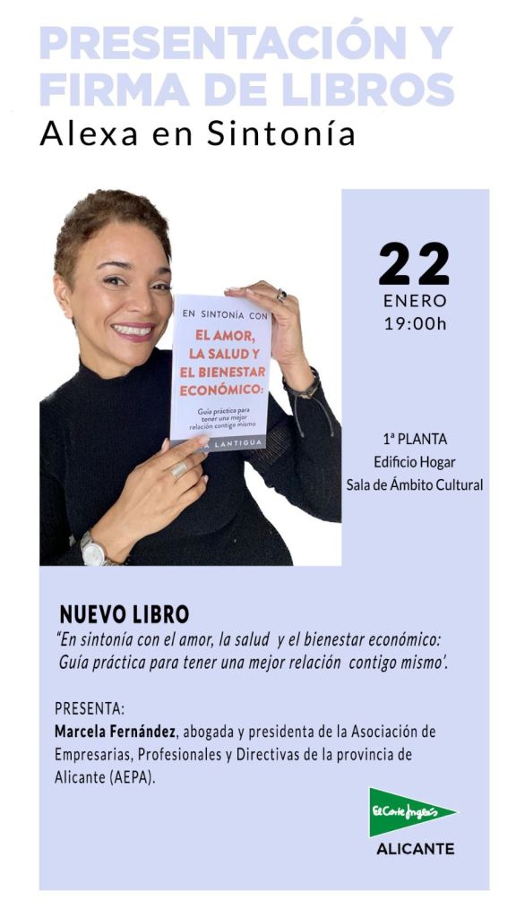 Iniciamos el año con presentaciones. En este caso, nuestra compañera Alexa en Sintonía presentará «El amor, la salud y el bienestar económico» el lunes 22 de enero a las 19:00 h. en la Sala de Ámbito Cultural de El Corte Inglés (Alicante).