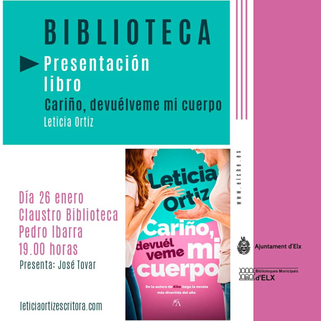 Leticia Ortiz realizará la presentación de su segunda novela «Cariño, devuélveme mi cuerpo» en la biblioteca Pedro Ibarra el día 26 de enero a las 19:00 h. Será un acto único en Elche, presentado por el escritor ilicitano José Tovar.