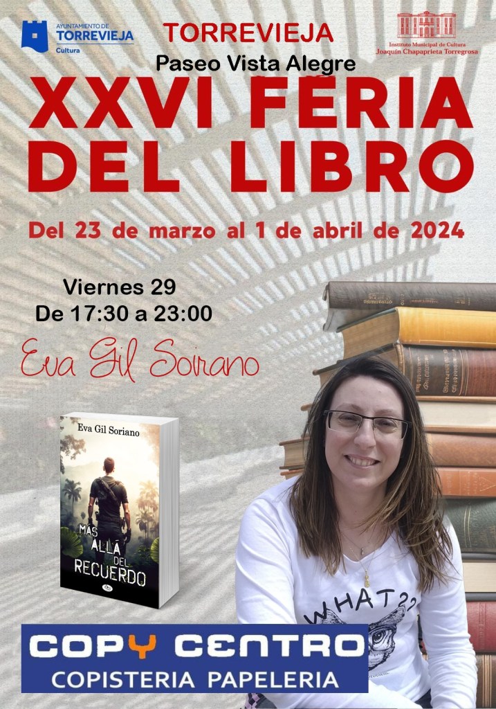 Torrevieja celebra su XXVI Feria del Libro en el Paseo Vista Alegre del 23 de marzo al 1 de abril. La escritora ilicitana Eva Gil Soriano estará allí, firmando sus libros, este viernes 29 de marzo de 17:30 a 23:00 en la caseta de Copy Centro. ¡Pasad a conocerla!
