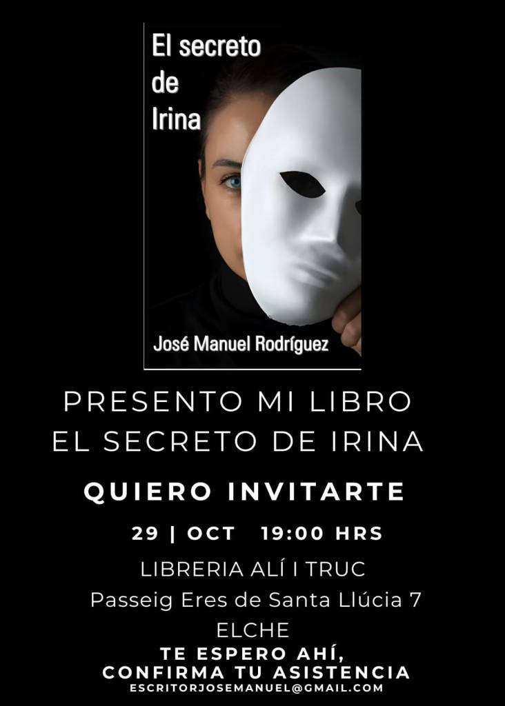 Nuestro compañero José Manuel Rodríguez nos presenta su tercer libro, «El secreto de Irina» en la Librería Ali i Truc de Elche, este 29 de octubre a las 19:00 h. Tendremos la oportunidad de oír de su propia boca todo lo referente sobre esta nueva obra, su proceso creativo y lo que podemos encontrar en ella. Aprovecha la oportunidad para conocerle si aún no lo has hecho, y llevarte tu ejemplar firmado y dedicado. ¿Te animas?