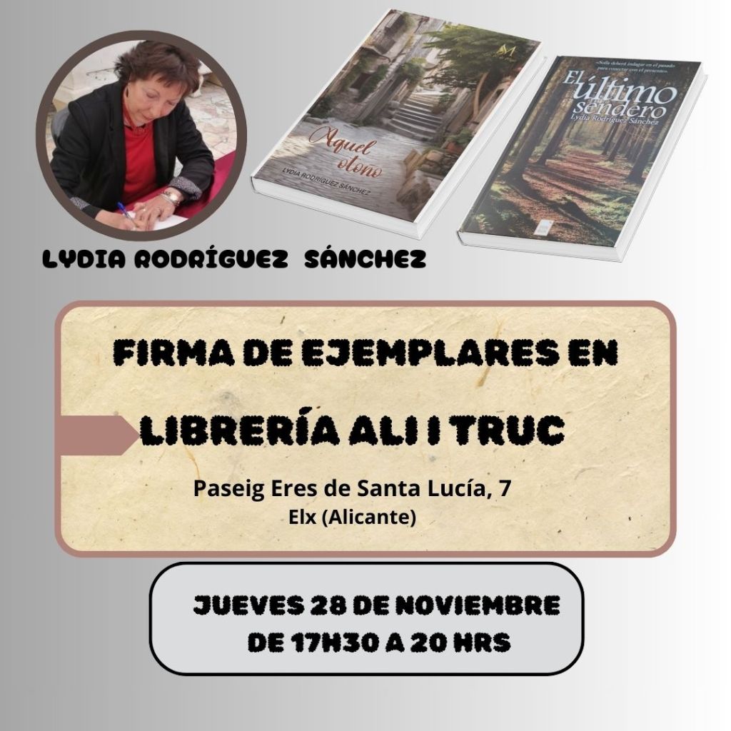 Nuestra autora Lydia Rodríguez firma ejemplares en la librería ALI I TRUC de Elche, el jueves 28 de noviembre de 17:30 a 20:00 horas. Descubre sus novelas intimistas, llenas de sentimientos y descubrimientos. ¡No te las pierdas!