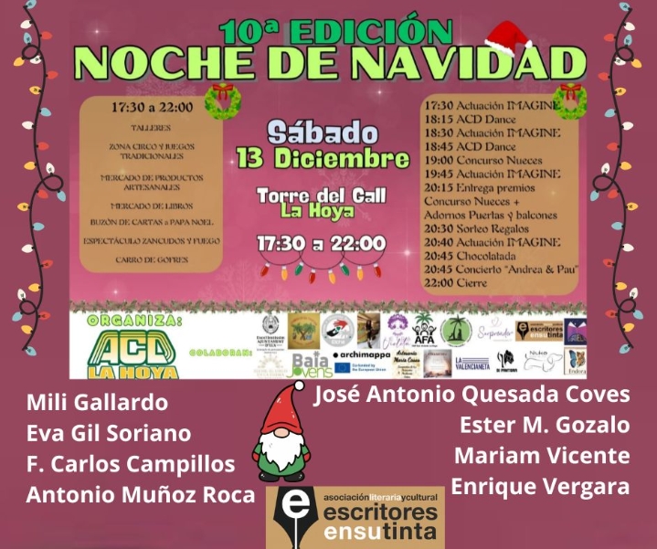 Ya es tradición para Escritores en su Tinta acudir a la «Noche de Navidad» organizada por ACD La Hoya. Allí concurrirán algunos de nuestros autores con sus libros de 17:30 a 22:00. Estamos seguros que de que encontraréis vuestra literatura favorita entre ellos.