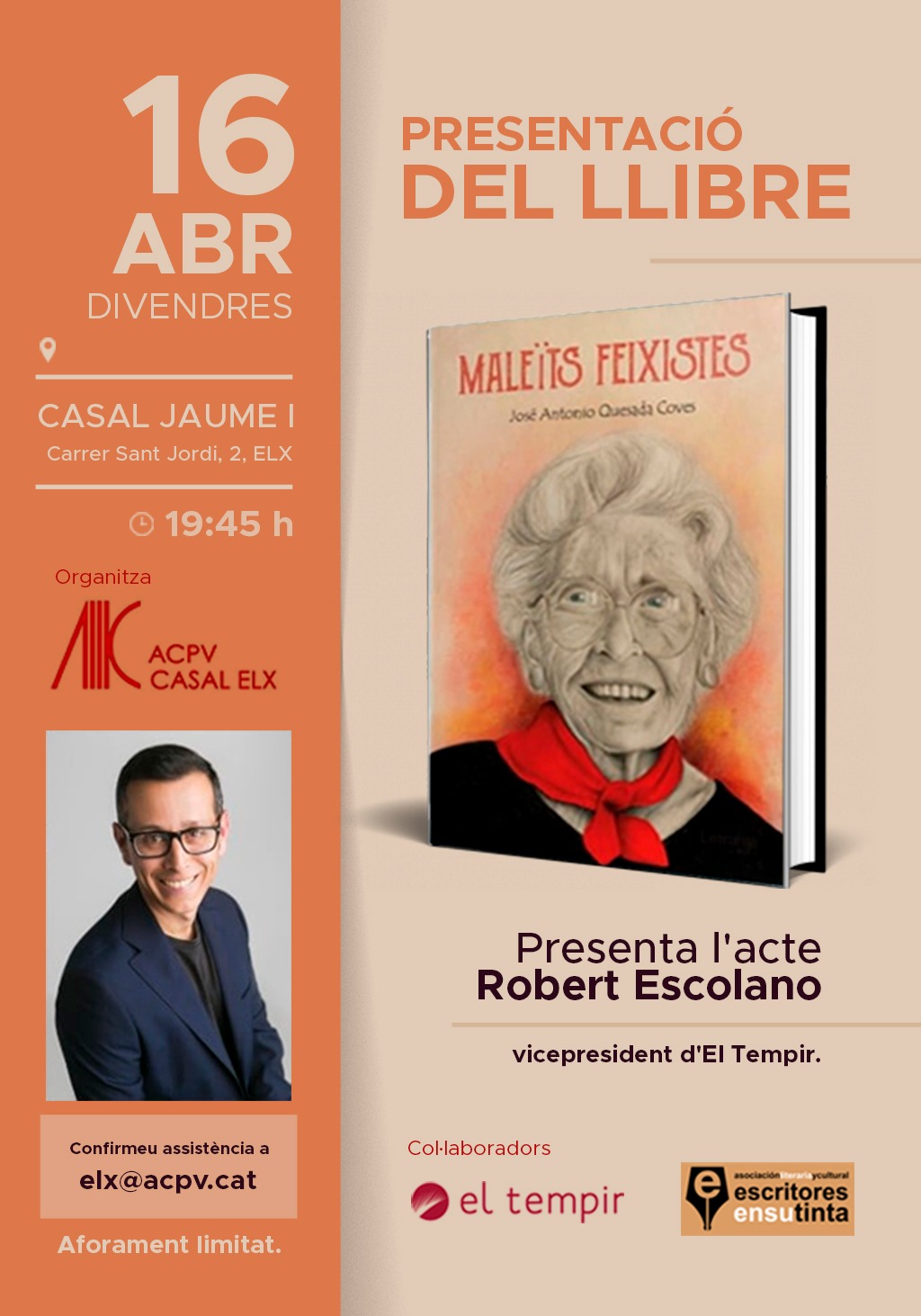 José Antonio Quesada Coves estará de nuevo en Elche el día 16 de Abril con «Maleïts feixistes» realizando una presentación en el Casal Jaume I, a las 19’45 horas. Es necesario reservar plaza escribiendo un correo a elx@acpv.cat