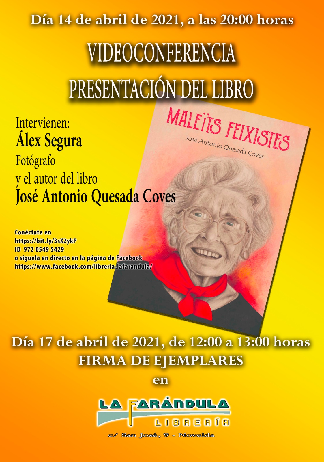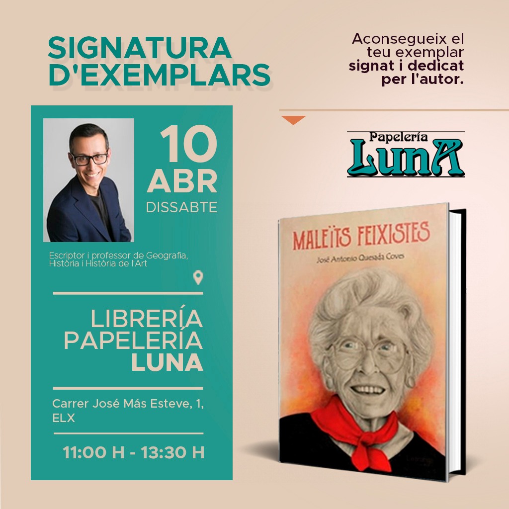Por orden cronológico, el día 10 de abril, José Antonio Quesada Coves estará firmando ejemplares de su última novela «Maleïts feixistes» en la librería-papelería Luna, situada en la calle José Más Esteve 1, de Elche.