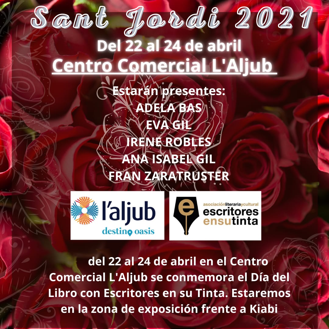 Los días 22, 23 y 24 de abril estaremos conmemorando San Jordi en el Centro Comercial L’Aljub de Elche. Serán 3 jornadas en las que estarán presentes Adela Bas, Ana Isabel Gil, Eva Gil, Irene Robles y Fran Zaratruster firmando ejemplares de sus obras para celebrel día del libro.
