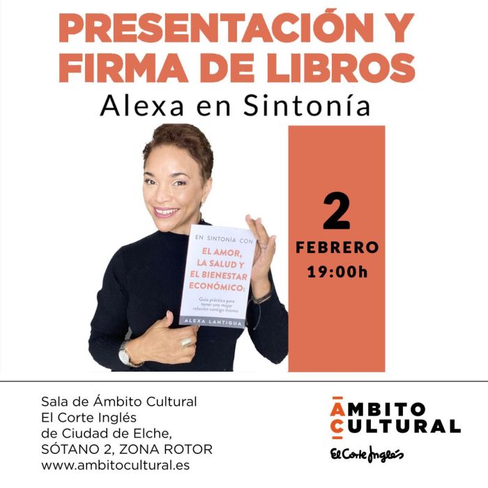 Continuamos con los eventos, y en este caso será Alexa en Sintonía, la escritora, que presentará su trabajo en El Corte Inglés de Elche. Podréis asistir para acompañarla el día 2 de febrero a las 19:00 h.Recordad que vamos informando periódicamente de las firmas y presentaciones de nuestros autores para que no os perdáis nada.
