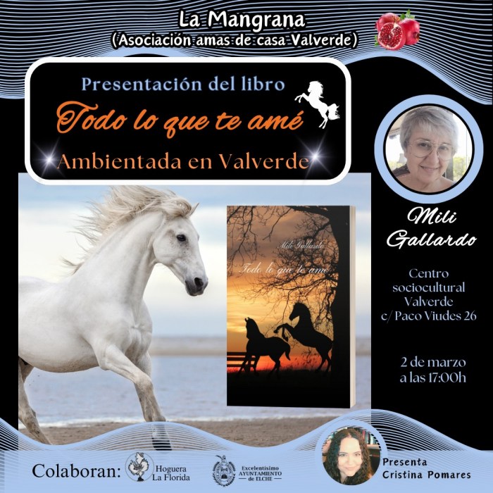 Presentación del libro «Todo lo que te amé», de nuestra compañera Mili Gallardo.Un historia ambientada en la pedanía de Valverde, en Elche, donde trata con maestría temas como el amor, la familia y la superación personal en una época, de 1940 a 1975, donde la valía de una mujer estaba marcada por las apariencias.¿Quieres descubrir … Continuar leyendo PRESENTACIÓN NUEVO LIBRO DE MILI GALLARDO