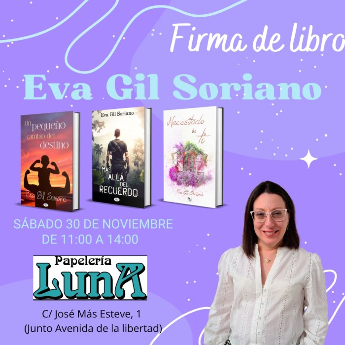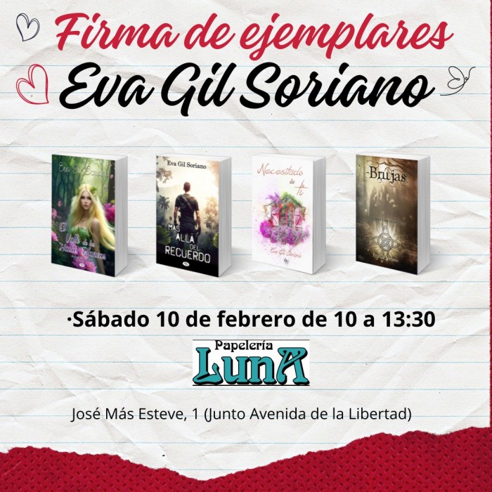 El sábado 30 de noviembre la autora Eva Gil Soriano volverá a la Papelería-Librería Luna. Es una prolífica autora de novela romántica cuyas numerosas obras se están convirtiendo en unas de las más leídas y buscadas tanto en redes como en las ferias adonde acude. Estará firmando ejemplares de 11:00 a 14:00h.Os animo a conocerla … Continuar leyendo FIRMA DE EJEMPLARES