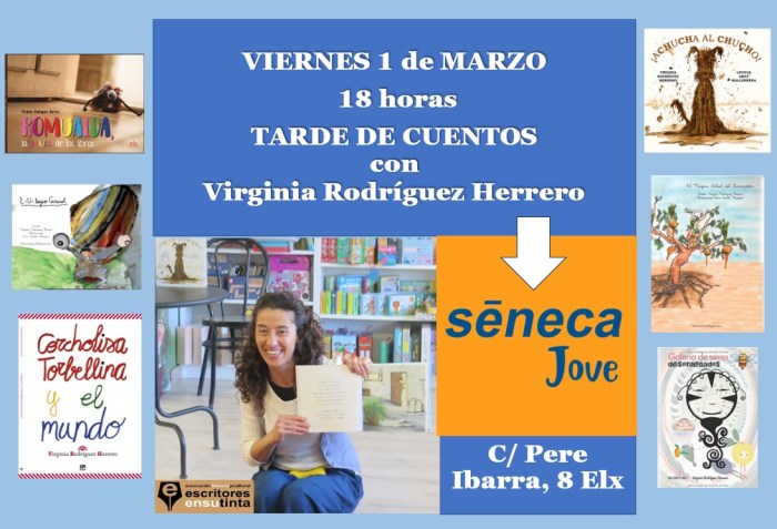 El viernes 1 de marzo a las 18 h. la autora Virginia Rodríguez Herrero ofrecerá una tarde de cuentos en la librería Séneca Jove acompañada de todos sus libros y todos sus personajes. Vente a compartir historias peludas, nutritivas y desordenadas.