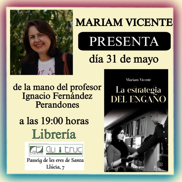 No os perdáis la presentación oficial de la nueva novela de Mariam Vicente: «La estrategia del engaño», finalista del Premio Azorín de Novela. Una historia sobre las redes de la mentira, repleta de intriga y con la Guerra Civil como telón de fondo. Será el viernes 31 de mayo en la Librería Ali i truc … Continuar leyendo PRESENTACIÓN DE «LA ESTRATEGIA DEL ENGAÑO» de Mariam Vicente