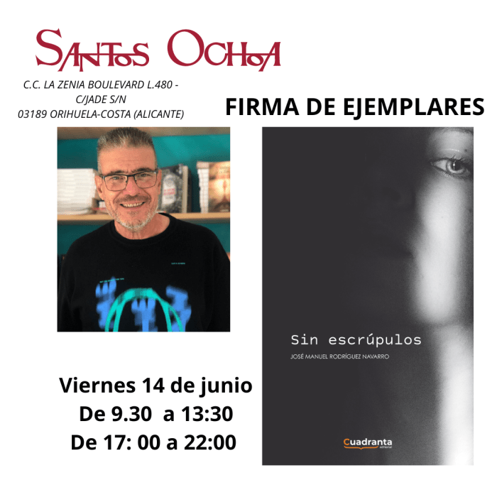 José Manuel Rodríguez estará firmando ejemplares de su novela «Sin escrúpulos» este viernes 14 de junio en la librería Santos Ochoa, en el C.C. La Zenia Boulevard. Aprovecha para conocerle y charlar con él sobre su obra y su pasión por escribir, además de llevarte tu ejemplar firmado y dedicado.