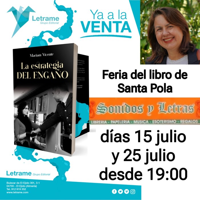 La Feria del Libro de Santa Pola acogerá a varios autores de nuestra asociación. Estad atentos, porque iremos incorporando nueva información en los próximos días. Nuestra compañera Mariam Vicente estará presente en dicha Feria para firmar ejemplares de su nueva novela «La estrategia del engaño», de la editorial Letrame. En librería Sonidos y Letras lo … Continuar leyendo FIRMA DE LIBROS EN SANTA POLA