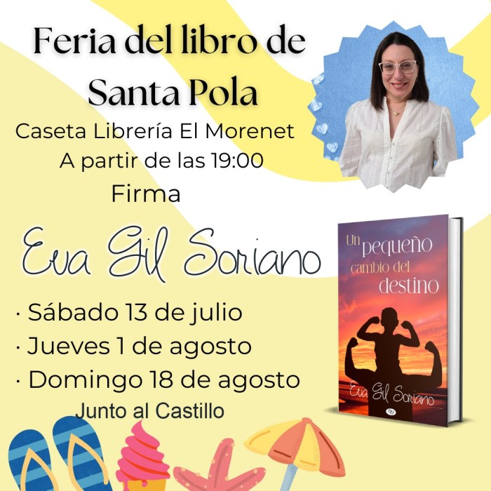 Como todos los veranos, Santa Pola realiza su anual Feria del Libro junto al Castillo, en la que nuestra compañera Eva Gil Soriano estará presente, firmando sus exitosos libros, los días 13 de julio y 1 y 18 de agosto, en la caseta de la Librería El Morenet a partir de las 19:00 h. de … Continuar leyendo FIRMA DE LIBROS