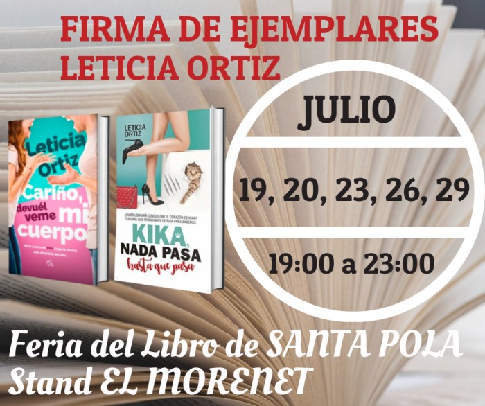 Y también Leticia Ortiz regresa como cada año a la Feria del Libro de Santa Pola. En julio podréis encontrarla con su nueva y divertidísima novela «Cariño, devuélveme mi cuerpo» en el stand de El Morenet los días 19, 20, 23, 26 y 29 a partir de las 19:00 h. Y por supuesto, también con … Continuar leyendo Y MÁS FIRMAS DE LIBROS EN SANTA POLA