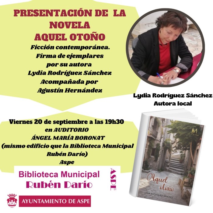 Nuestra compañera Lydia Rodríguez Sánchez tiene ya nueva novela: «Aquel otoño»; y tiene el placer de presentarla el próximo viernes 20 de septiembre a las 19:30 en la Biblioteca Municipal de Aspe. Si ya conoces su excelente forma de escribir, seguro que no te lo vas a perder. Y si no la conoces, ahora tienes una … Continuar leyendo PRESENTACIÓN DE LA NUEVA NOVELA DE LYDIA RODRÍGUEZ
