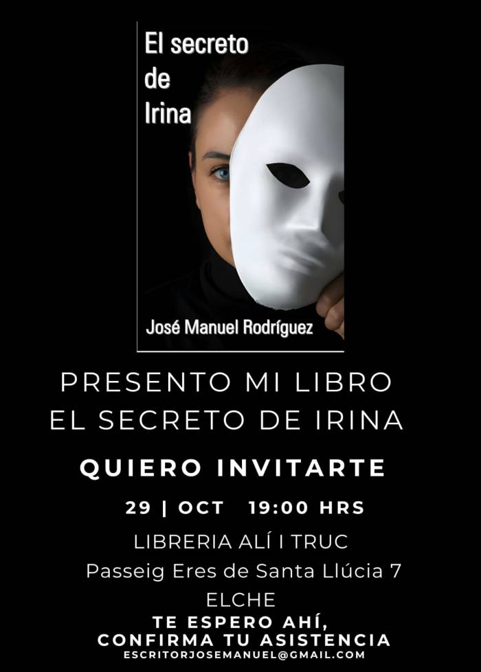 Nuestro compañero José Manuel Rodríguez nos presenta su tercer libro, «El secreto de Irina» en la Librería Ali i Truc de Elche, este 29 de octubre a las 19:00 h. Tendremos la oportunidad de oír de su propia boca todo lo referente sobre esta nueva obra, su proceso creativo y lo que podemos encontrar en … Continuar leyendo PRESENTACIÓN DE «EL SECRETO DE IRINA»