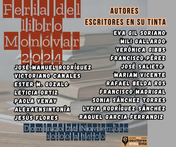 ¿Te apetece algo diferente esta Fira de Santa Caterina? ¡Acompáñanos a la Feria del libro de Monóvar 2024! Este próximo domingo 24 de noviembre de 10:00 h. a 14:00 h. frente al ayuntamiento, descubre con nosotros nuevos mundos, personajes inolvidables y aventuras que desearás que no terminen. ¡No te pierdas a nuestros autores y llévate sus … Continuar leyendo FERIA DEL LIBRO EN MONÓVAR (FIRA DE SANTA CATERINA)