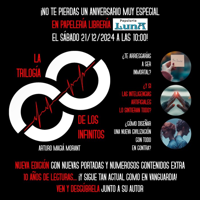 Este próximo sábado 21, de 10:00 a 13:00 h., nuestro compañero Arturo Maciá Morant firmará en la Papelería Librería Luna la edición especial 10° aniversario de la «TRILOGÍA DE LOS INFINITOS».Será su última firma de este 2024. No os la perdáis y disfrutad de los misterios, las intrigas, las aventuras y desventuras de sus protagonistas; … Continuar leyendo 4ª PRESENTACIÓN DE LA NUEVA EDICIÓN DE «TRILOGÍA DE LOS INFINITOS»