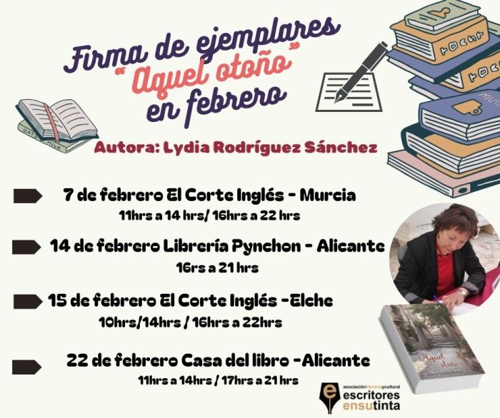 La autora Lydia Rodríguez Sánchez, miembro de la asociación, firmará ejemplares de su segunda novela «Aquel otoño» en El Corte Inglés de Elche, y la Casa del libro y Librería Pynchon de Alicante, durante el mes de febrero. Publicamos dos extractos de una reseña de Laivetobooks:«Dos historias que convergen en una. Dos mujeres tocadas y … Continuar leyendo FIRMA DE LIBROS