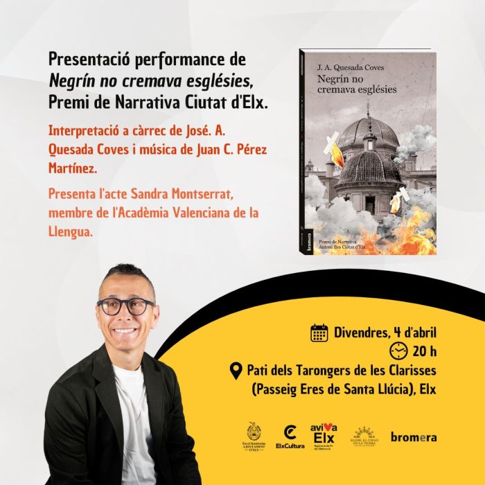 El divendres 4 d'abril (20:00 h) al Pati dels Tarongers de Les Clarisses el nostre company José Antonio Quesada Coves presentarà la seua última novel·la: «Negrín no cremava esglésies». L'acte, presentat per Sandra Montserrat (membre de l'Acadèmia Valenciana de la Llengua), consistirà en una performance literària a càrrec de l'autor, que serà acompanyat amb la … Continuar leyendo PRESENTACIÓN-PERFORMANCE: «NEGRÍN NO CREMAVA ESGLÉSIES»