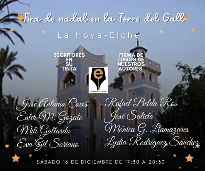 Algunos miembros de nuestra asociación regresarán a la Feria de Navidad que anualmente se realiza en la Torre del Gall de La Hoya (Elche). El sábado 16 de diciembre de 17:30 a 20:30 ofrecerán buena literatura para aquellos lectores que quieran ir a conocer sus letras. Aprovechad para conocer todas sus novedades y os atenderán … Continuar leyendo FIRA DE NADAL EN LA HOYA (ELCHE)