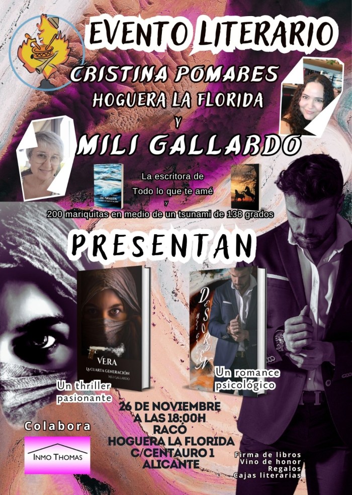El próximo 26 de noviembre nuestra compañera Mili Gallardo presentará sus dos últimos libros. Lo hará patrocinada por Hoguera La Florida y acompañada de Cristina Pomares en el Racó de la hoguera (en Calle Centauro, n°1, de Alicante, a las 18:00). Sus dos libros más recientes son: «Vera. La cuarta generación», un thriller policíaco; y … Continuar leyendo MILI GALLARDO PRESENTA SUS DOS ÚLTIMAS OBRAS