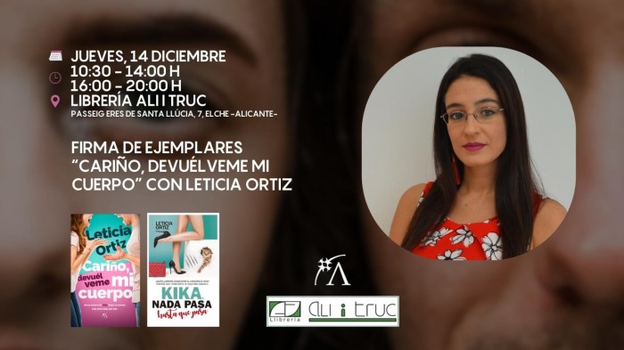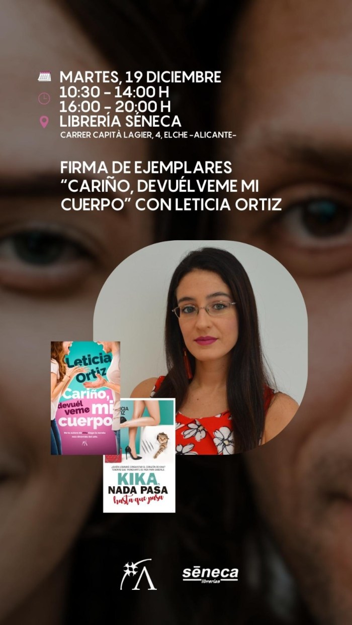 El jueves 14 de diciembre, nuestra escritora Leticia Ortiz firmará ejemplares de su nueva novela «Cariño, devuélveme mi cuerpo» junto a su anterior obra en librería Ali i Truc (Elche). En horario de mañana y tarde.¡No os lo perdáis!