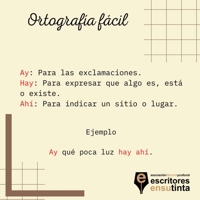 La segunda, es hay. Esta se escribe igual que la anterior, pero con h delante, ya que pertenece al verbo haber, concretamente al modo impersonal del presente indicativo. Nos indica que algo es, está o existe.
